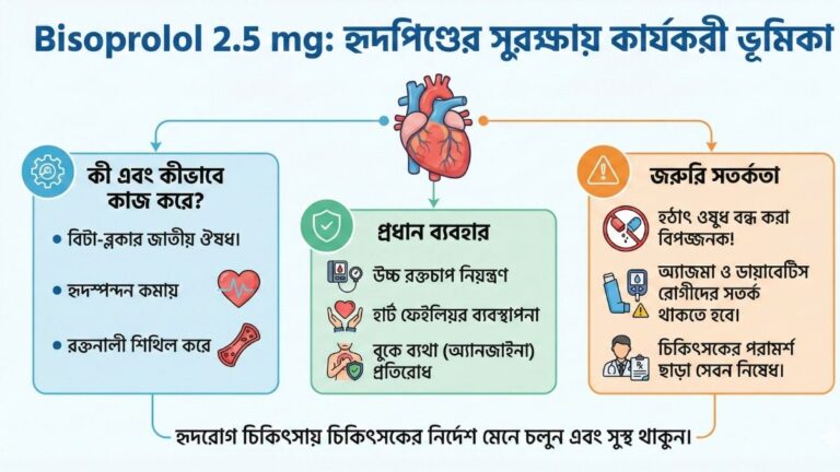 Bisoprolol 2.5 mg হলো একটি বিটা-ব্লকার (Beta-blocker) জাতীয় ঔষধ। এর প্রধান কাজ হলো হার্ট রেট বা হৃদস্পন্দন কমিয়ে হৃদপিণ্ডকে ধীরস্থিরভাবে …