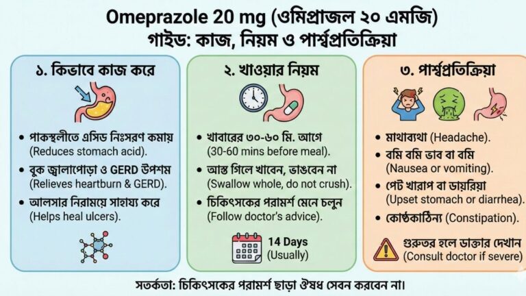 Omeprazole 20 mg (ওমিপ্রাজল ২০ এমজি) হলো একটি প্রোটন পাম্প ইনহিবিটর (PPI) জাতীয় ঔষধ। এর প্রধান কাজ হলো পাকস্থলীতে অতিরিক্ত …